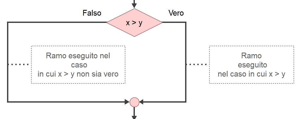 Valuta una condizione, cioè un’espressione o una domanda che può avere solo risposta vero o falso. In caso vero, il programma prosegue con i blocchi sulla destra. In caso falso, il programma prosegue con i blocchi sulla sinistra. Al termine il programma continua dritto.