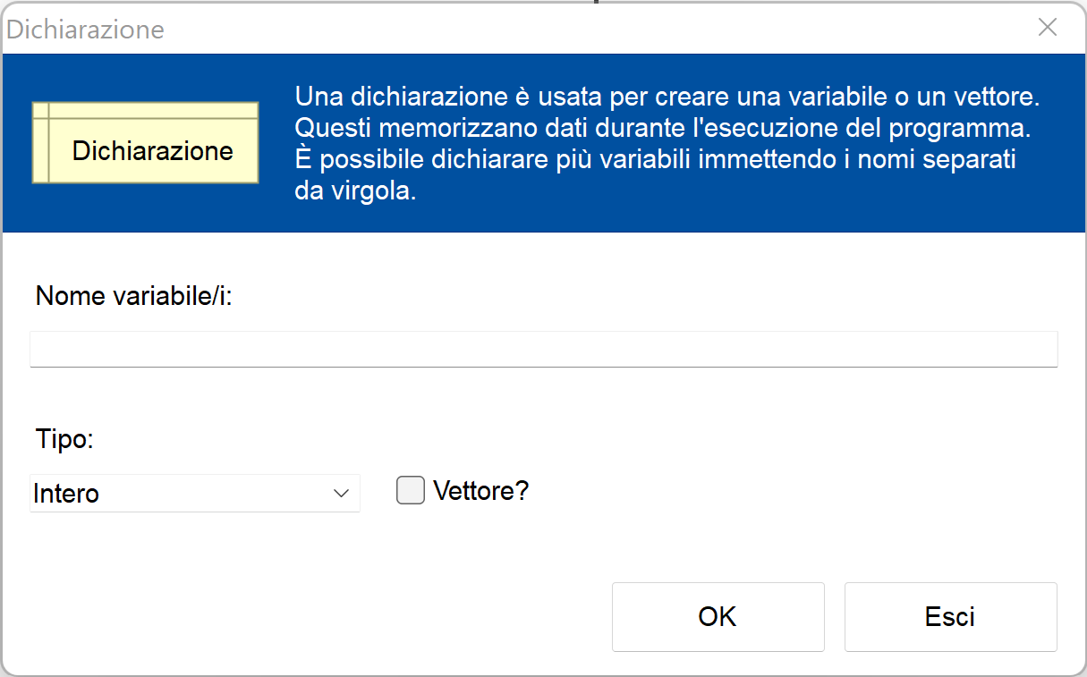 Il blocco Dichiarazione introduce nel programma una o più variabili,