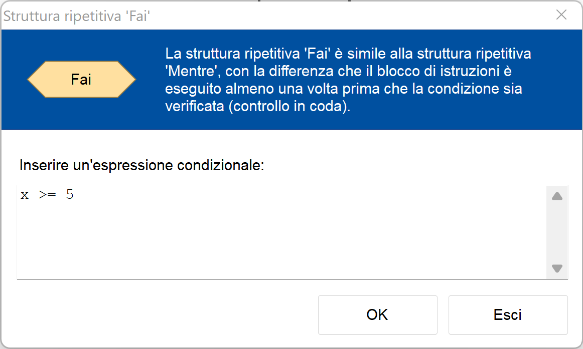 Quando la condizione diventa falsa, il ciclo si interrompe e il programma continua dopo il ciclo. I blocchi sulla destra vengono eseguiti almeno una volta, anche se la condizione è falsa fin dall’inizio: questa è la differenza fondamentale tra Fai e Mentre. In questo caso il contenuto del blocco viene eseguito almeno una volta. Nel caso di Mentre, è possibile che il contenuto non venga mai eseguito.