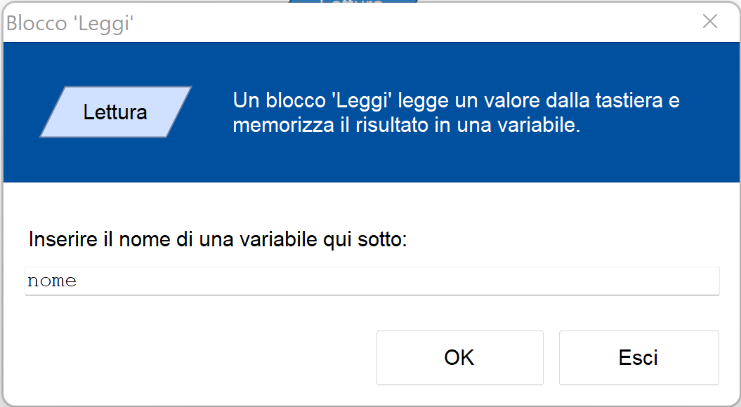 Durante la lettura, l’utente inserisce un valore e questo viene assegnato alla variabile, eliminando l’eventuale valore precedente memorizzato in precedenza. Nell’esempio viene letta la variabile nome.