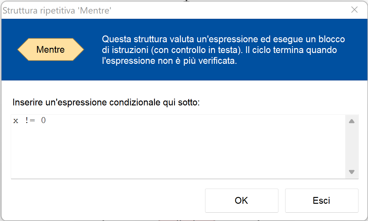 Per comprendere meglio questo blocco, immaginare si chiami Finché, che è una traduzione in italiano di Mentre più adatta a rappresentare il comportamento del blocco.