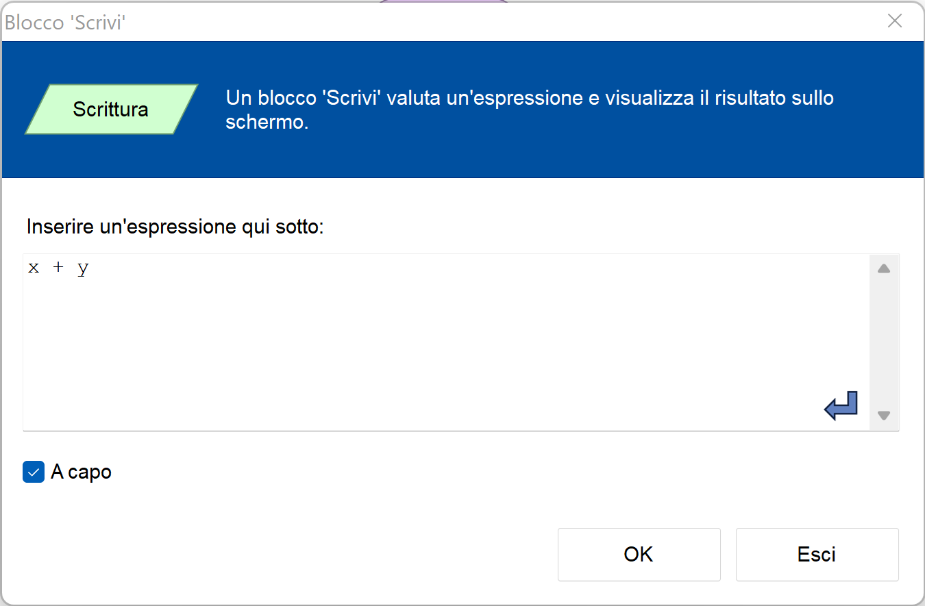 o più variabili, ad esempio x + y. Il programma scriverà la somma delle due variabili.