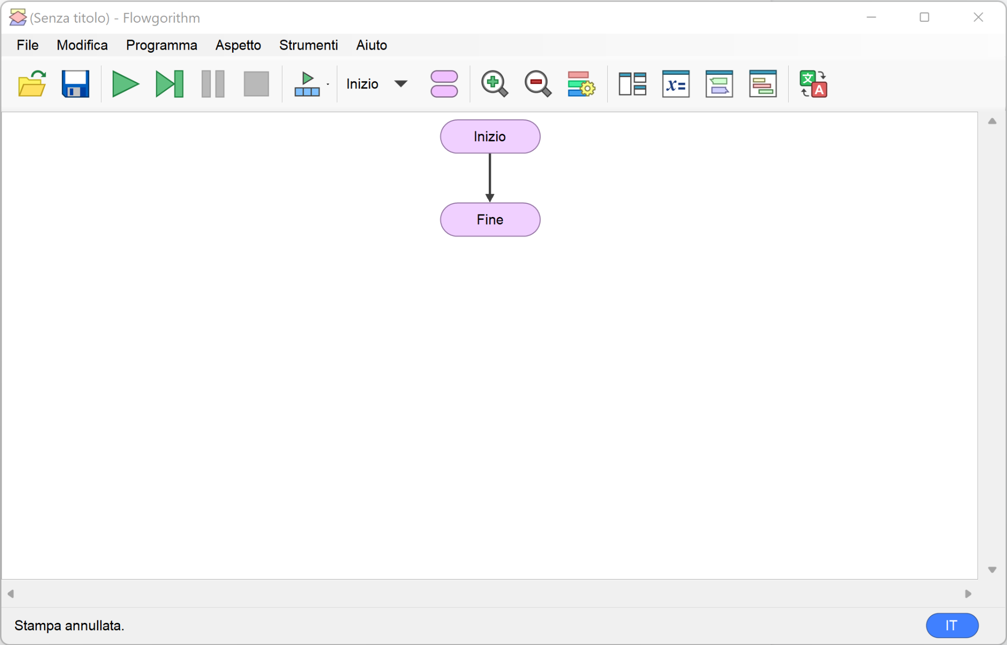 Aprire Flowgorithm cercandone l’icona sul desktop o nel menù Start. Creare un nuovo progetto. Apparirà questa schermata: